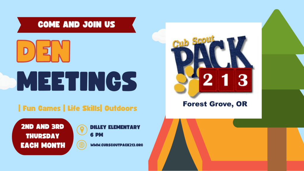 The Pack is divided up into dens, which are groups of about 3 to 10 kids of a similar age and school grade. Each den is led by a Den Leader, which is usually a parent of s scout in that den. Dens meet about 2 to 3 times a month.